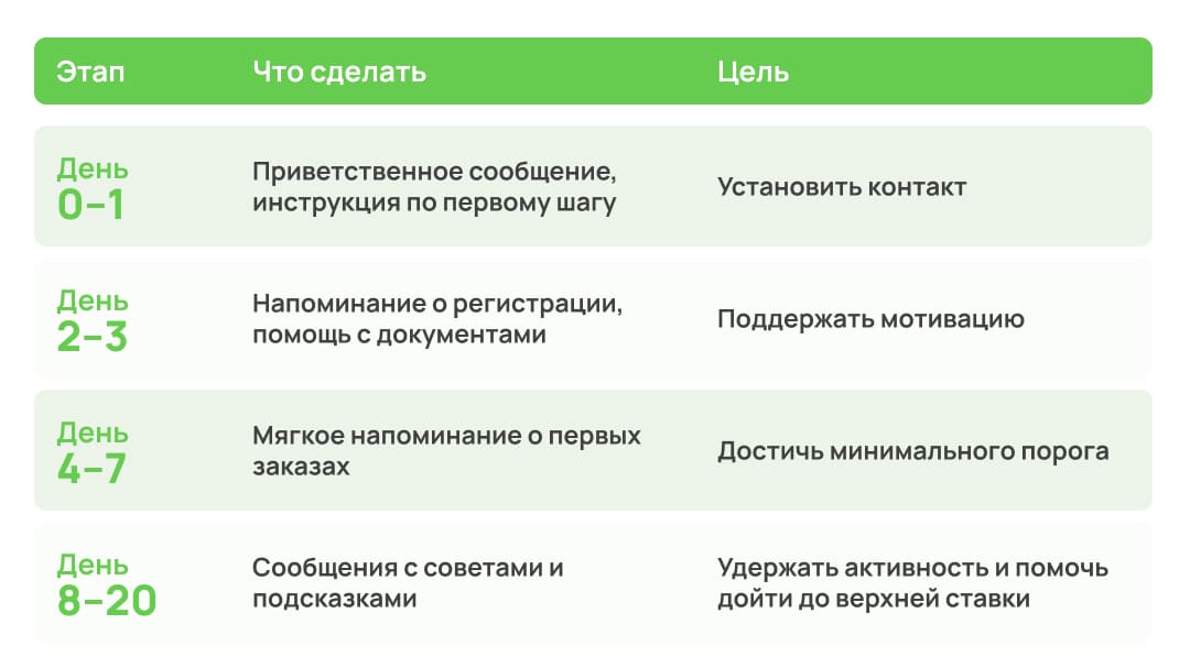 Если видно, что человек зарегистрировался, но не начал работать, это сигнал напомнить о себе. А если напротив, в статистике отражаются выполненные заказы и начисления, значит, сопровождение сработало.