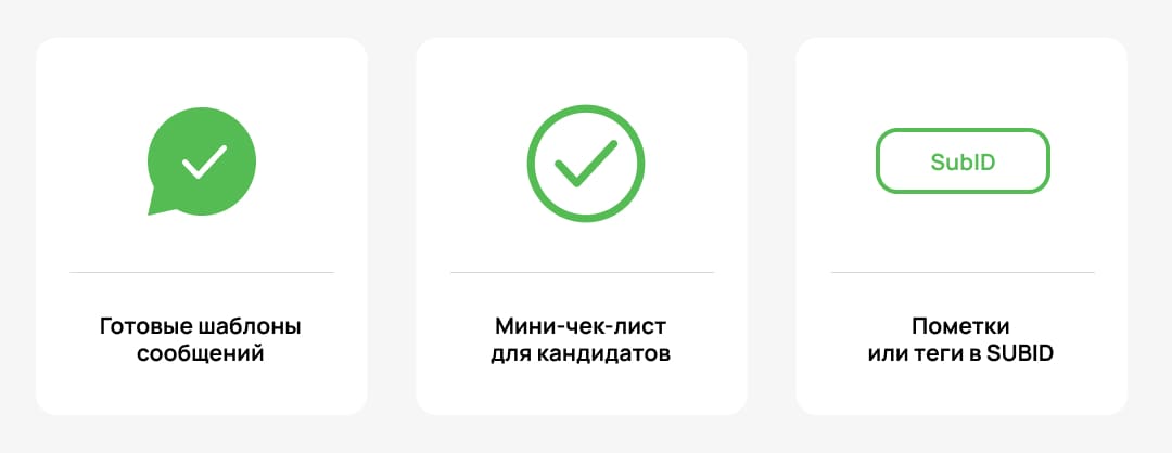 Такие шаблоны можно использовать вручную или подключить к автоотправке в мессенджере. Это экономит время и помогает выстраивать последовательную коммуникацию, где каждый кандидат получает нужную информацию в нужный момент. При этом сообщения остаются персонализированными: достаточно подставить имя или уточнить детали по конкретному офферу.