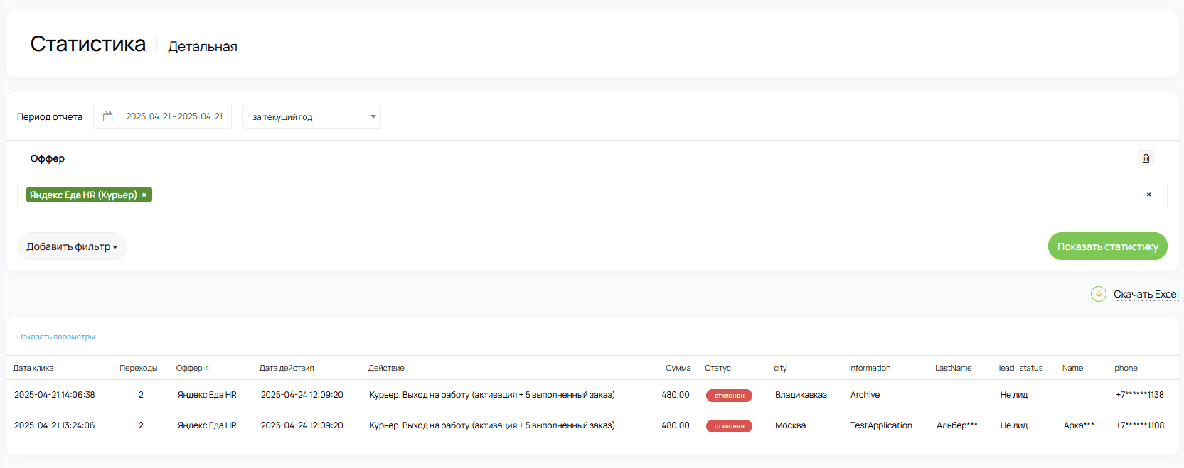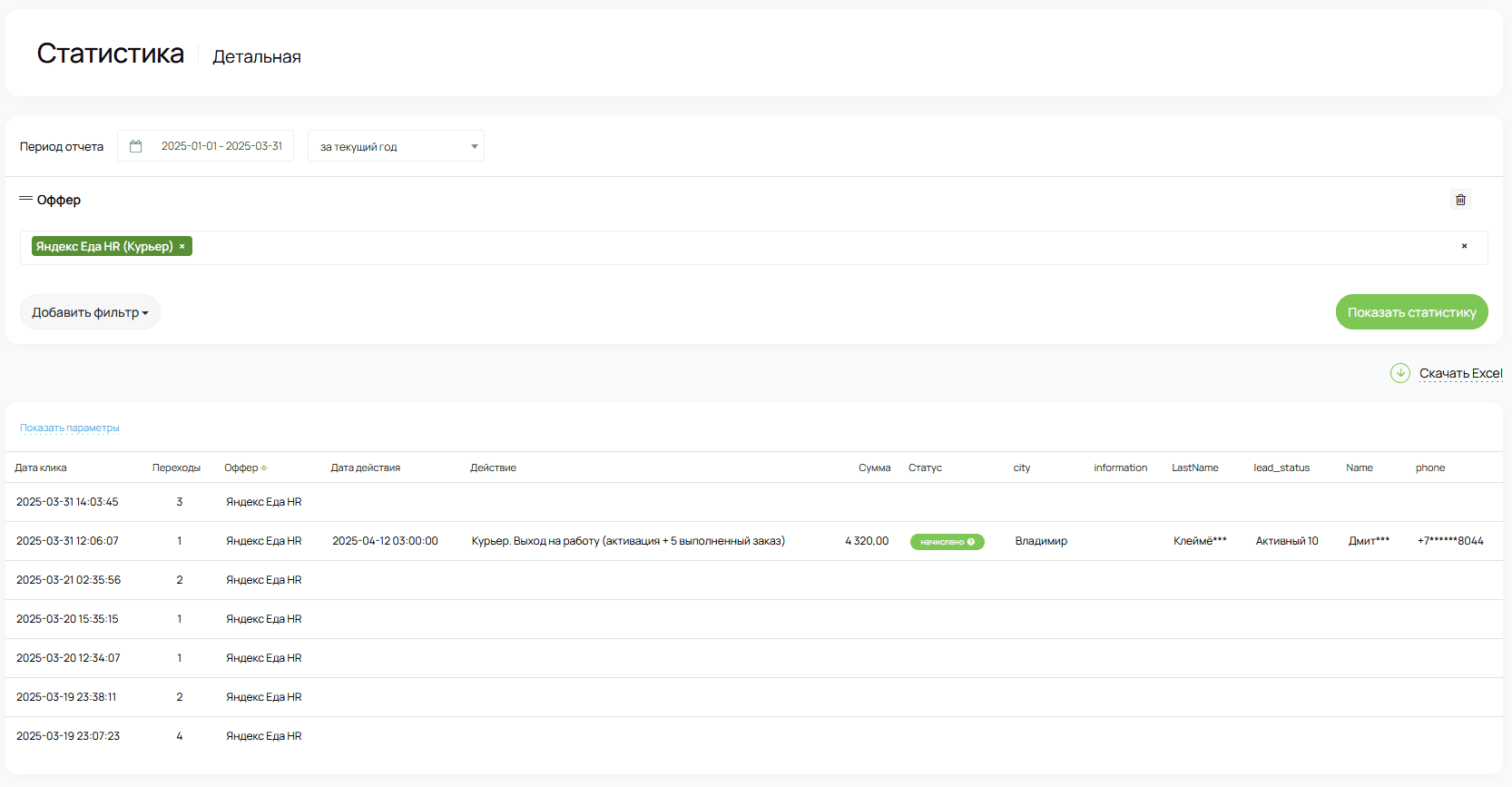 В личном кабинете Saleads в разделе «Детальная статистика» можно видеть путь каждого лида — от регистрации до первых заказов.