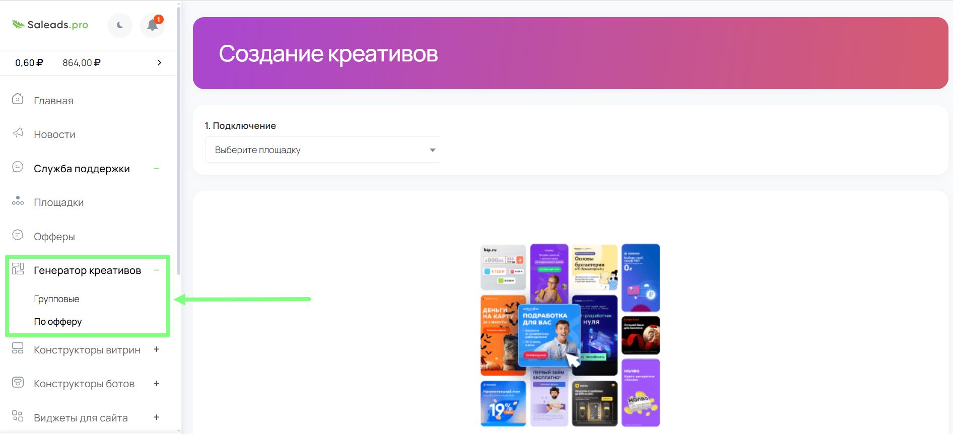Чтобы не тратить долгие часы на рутину, в личном кабинете Saleads.pro есть встроенный генератор креативов. С его помощью за несколько минут можно получить готовые баннеры и тексты с уже настроенными метками. Это значит, что тест оффера запускается быстрее, а арбитражник сразу получает данные для анализа и может сосредоточиться на главном: создании контента и монетизации, а не на рутинных технических деталях.