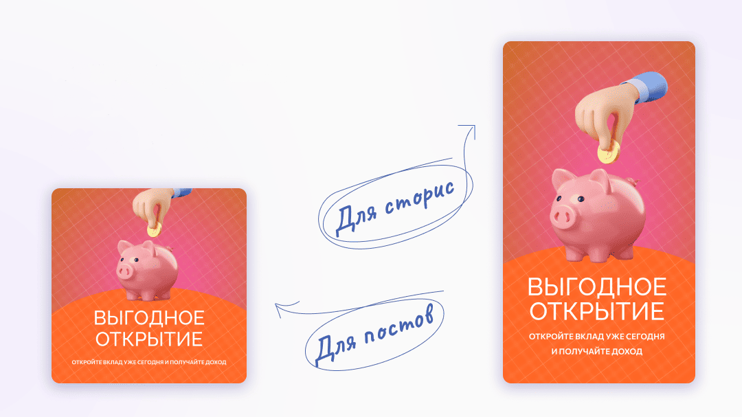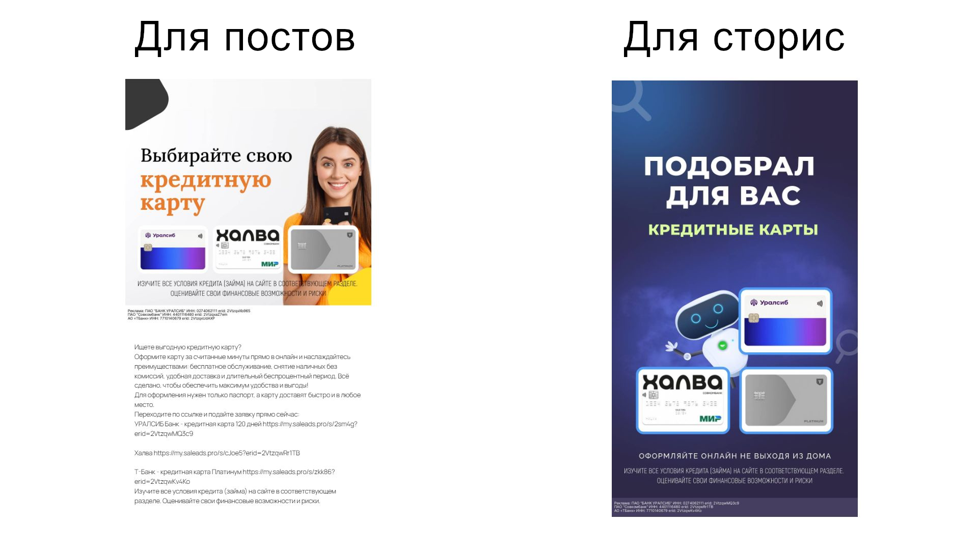 - Креативы для постов. Такой вариант включает сразу и текстовую часть, и графический баннер. Подходит для публикаций в блогах, Telegram-каналах, группах во «ВКонтакте». Формат универсальный — готовый пост можно размещать без доработки.