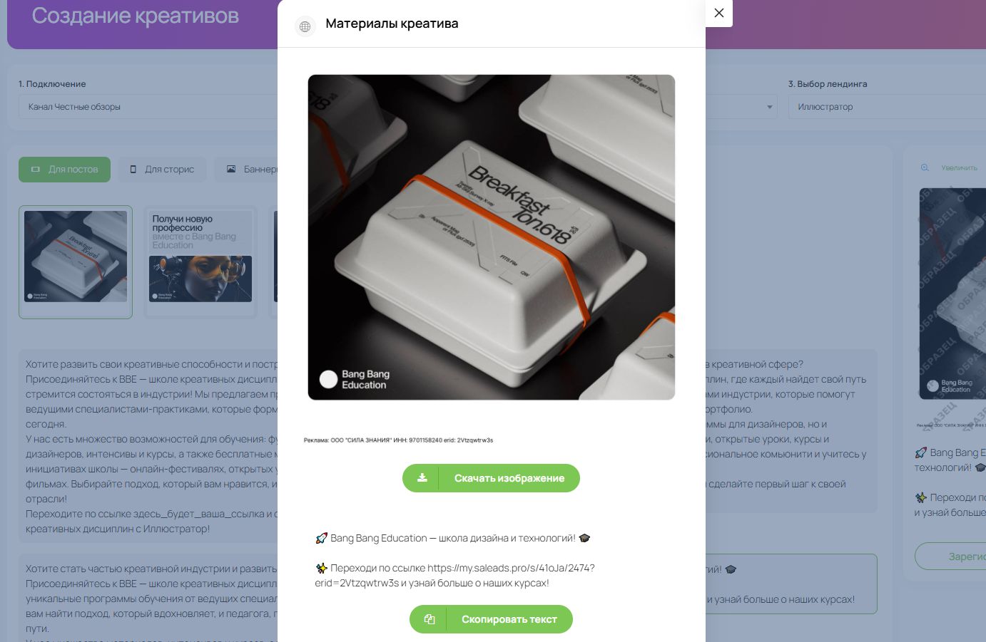 - Скорость. Подготовка креатива занимает всего 1–2 минуты. Вместо того чтобы заказывать дизайн, писать текст и вручную вставлять ссылки, вы получаете готовый материал за пару кликов. Это особенно важно для тестов: чем быстрее запускаются варианты, тем быстрее вы находите работающие связки.