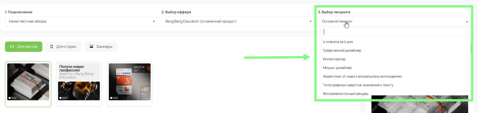 3.Выбор лендинга. Для некоторых офферов доступны сразу несколько лендингов. В таком случае система предложит выбрать, куда именно будут вести ссылки.