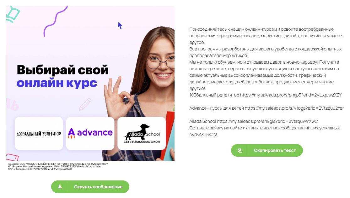 – Генератор креативов. Позволяет за несколько минут подготовить баннеры, тексты и ссылки под нужные офферы. Это экономит время и помогает поддерживать единый стиль.