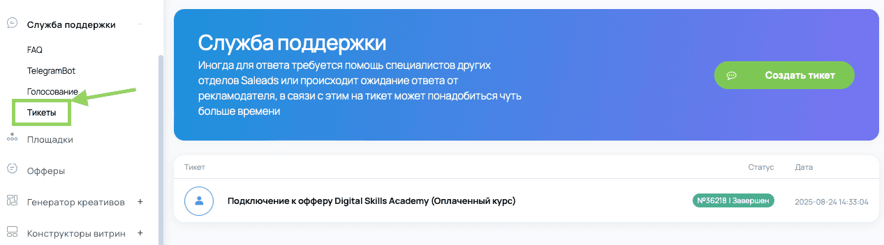 3) Служба поддержки. Система тикетов доступна в личном кабинете Салидс в соответствующем разделе: