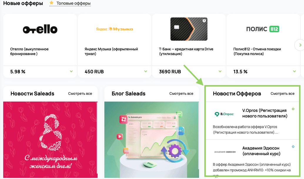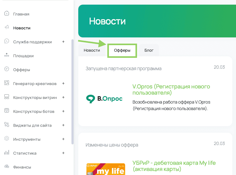 2) Раздел “Новости”. В этом разделе во вкладке “Офферы” вы можете увидеть обновления офферов.