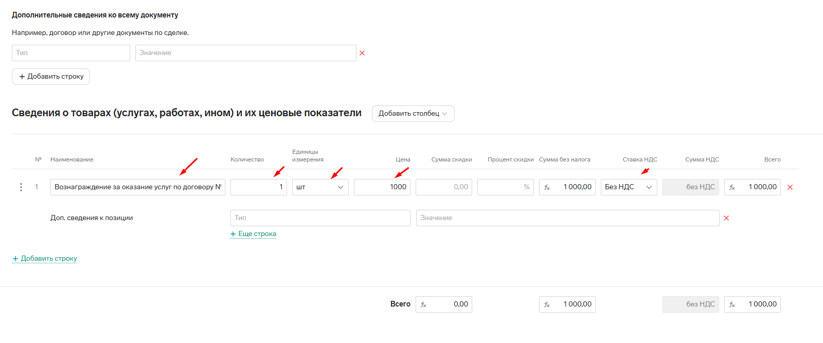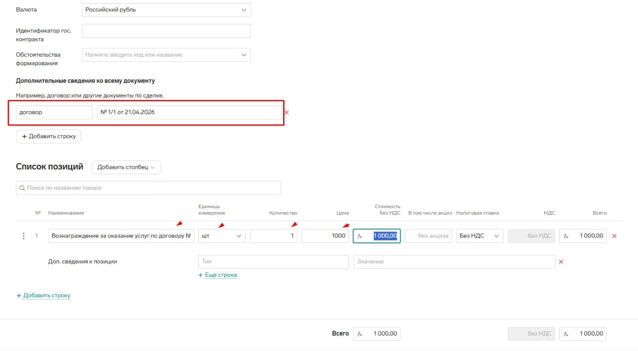 В разделе «Наименование» вы указываете: Вознаграждение за оказание услуг в сервисе Saleads.pro по Договору №… от …..