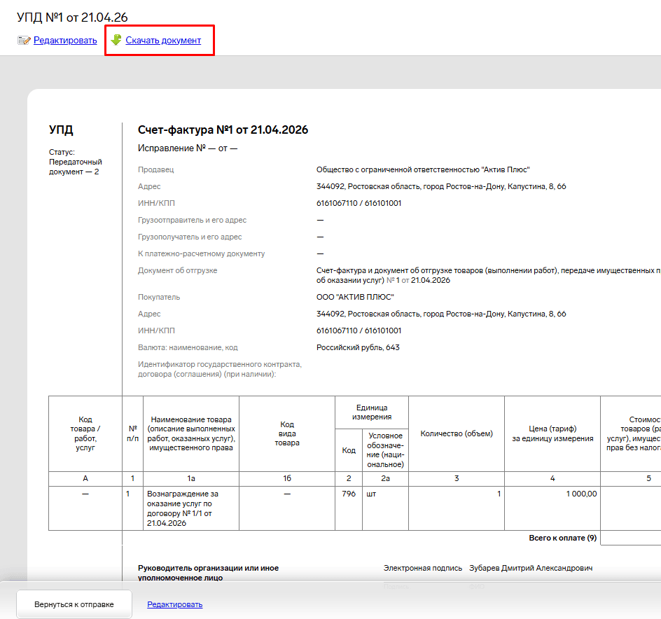 Сохраняете и отправляете документ нам по ЭДО, найти нас можно по ИНН (6161067110).