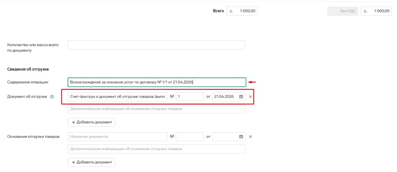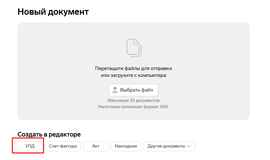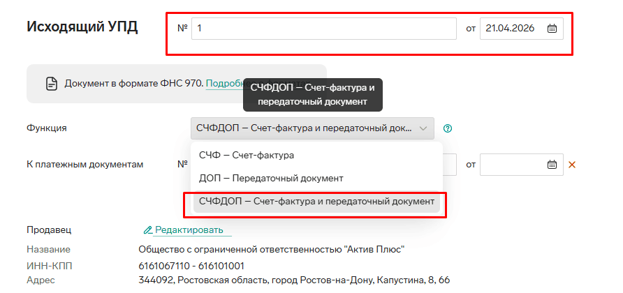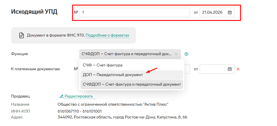 В случае формирования УПД, выбираете «ДОП – Передаточный документ».
