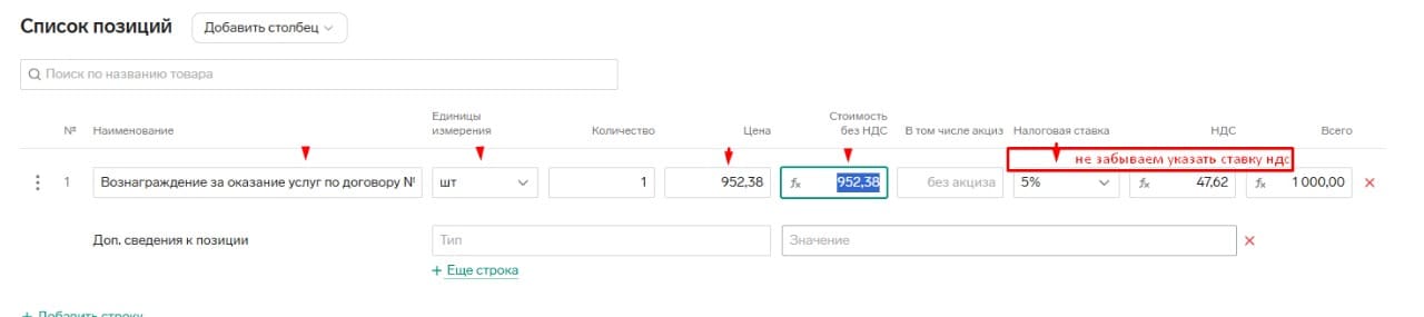 2. Там, где указываем стоимость наименования услуг, не забывайте указать ставку НДС и стоимость услуг с учетом этой ставки, как показано на примере: