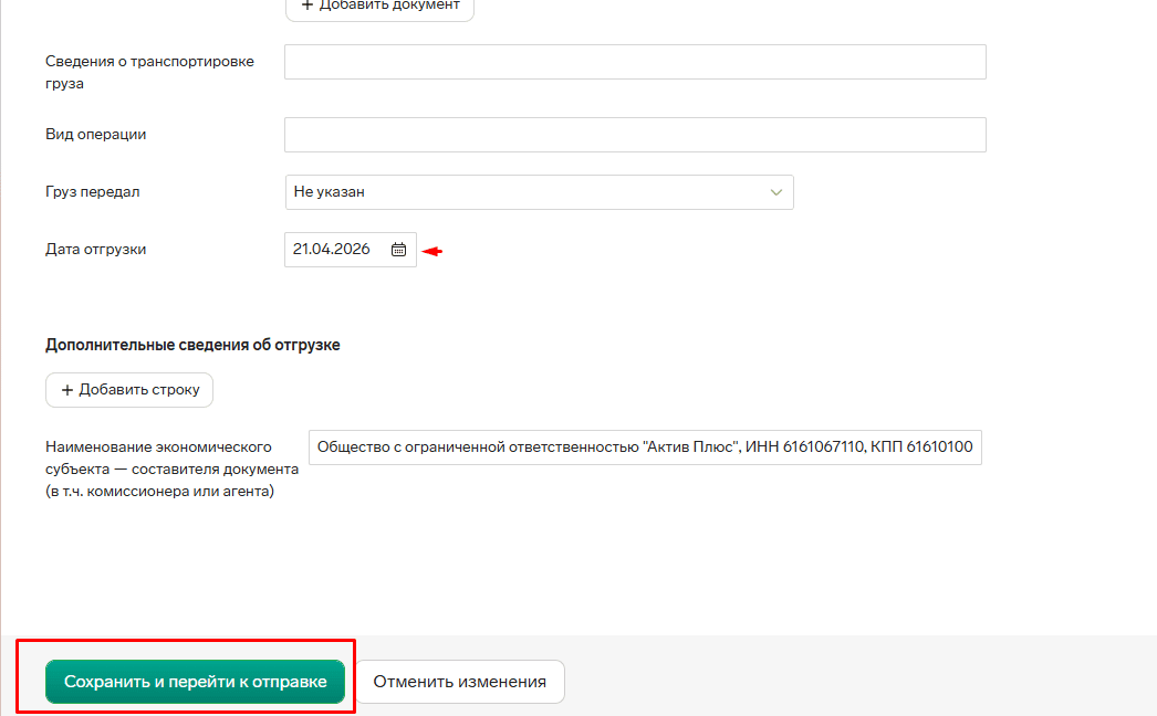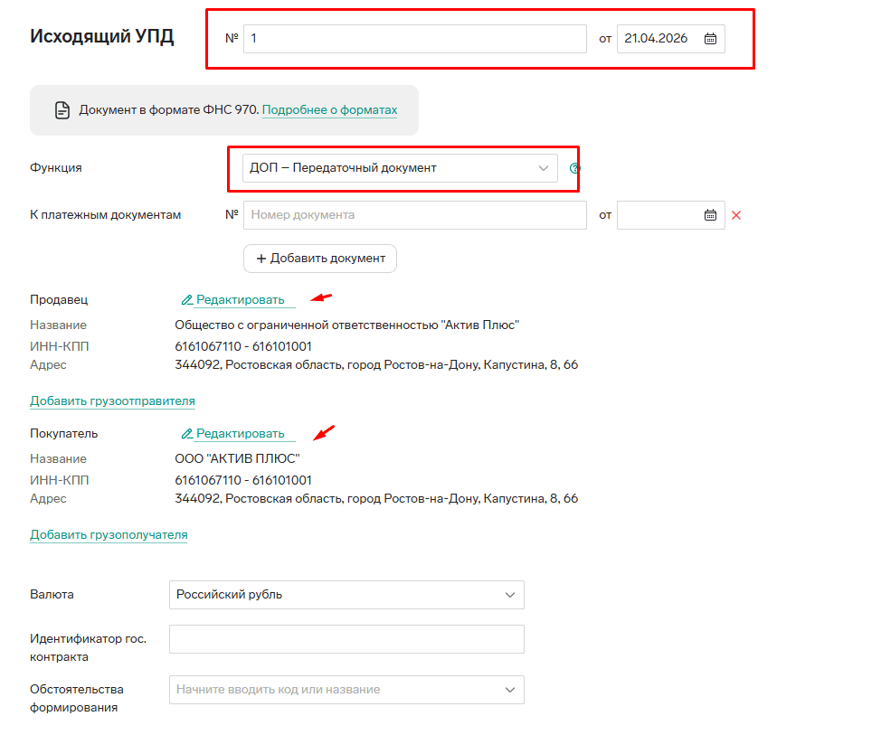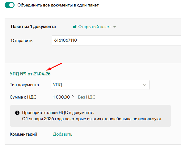 В поле «Отправить» указываете наше ИНН, обязательно проверьте номер УПД и дату.