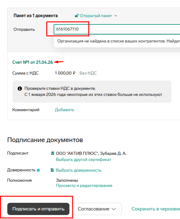 Перед тем, как подписать и отправить документ обязательно проверьте корректность номера и даты Счета, также корректность нашего ИНН.