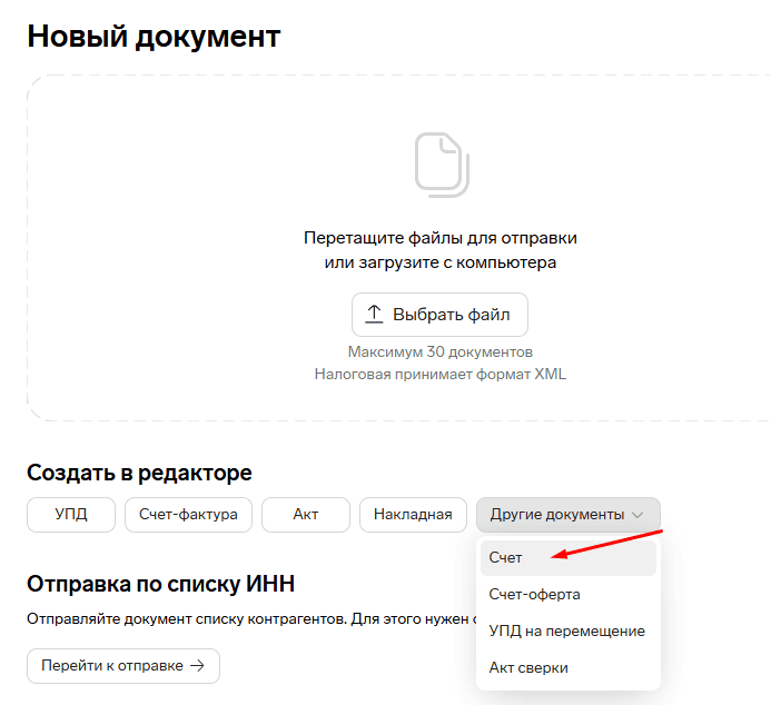 Сохраненные документы вы можете отправить в этой системе ЭДО, найдя нас по ИНН. Также вы можете сформировать счет в своей системе учета документов или системе ЭДО. Счет, также можно отправлять в формате PDF.