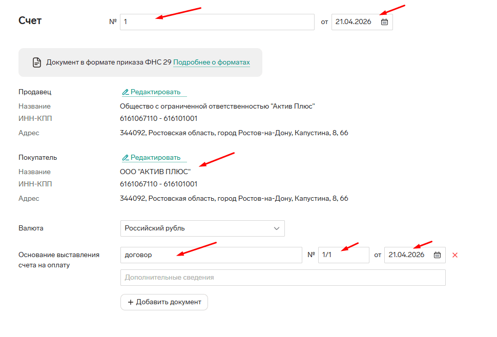 В разделе «Покупатель» указываете наши данные ( ООО “Актив плюс”, ИНН/КПП: 6161067110 - 616101001, адрес: 344092, Ростовская область, г. Ростов-на-Дону, ул. Капустина, д. 8, кв. 66.).