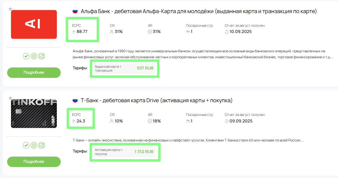 Важно помнить: ставка не всегда главный показатель. Например, за выдачу карты могут платить много, но одобряют её редко, и итоговый доход окажется небольшим. А вот карта с более низкой ставкой, но высоким процентом одобрений даст больше денег. Поэтому всегда смотрите на eCPC (эффективный заработок с клика).