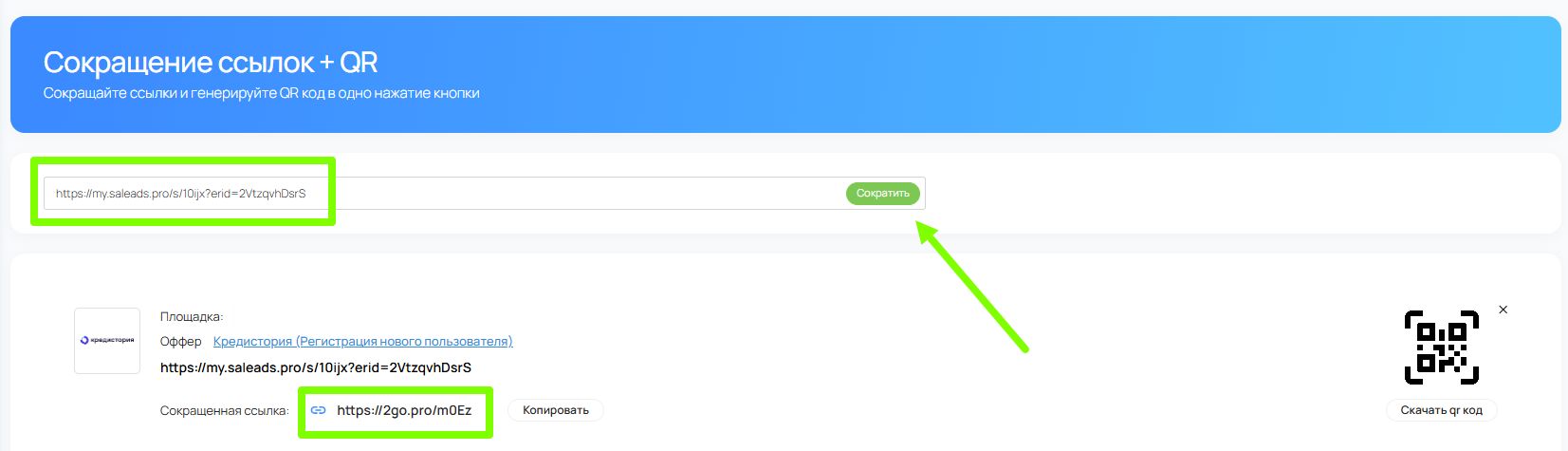 Инструмент превращает длинный URL в короткий. Такой ссылкой удобно делиться в соцсетях. Найти сократитель можно в разделе личного кабинета Инструменты → «Сокращение ссылок + QR».