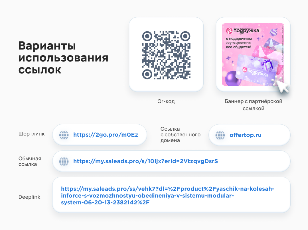 Давайте рассмотрим, какими бывают самые распространённые виды партнёрских ссылок. Каждый формат имеет свои особенности и лучше подходит под определённые площадки.