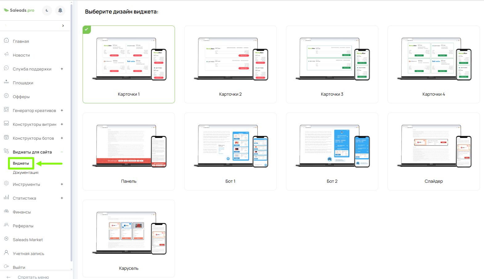 Виджеты — это готовые блоки с партнерскими ссылками, которые встраиваются прямо на сайт: между абзацами текста или в сайдбар. Найти их можно в одноимённом разделе личного кабинета Saleads.pro.