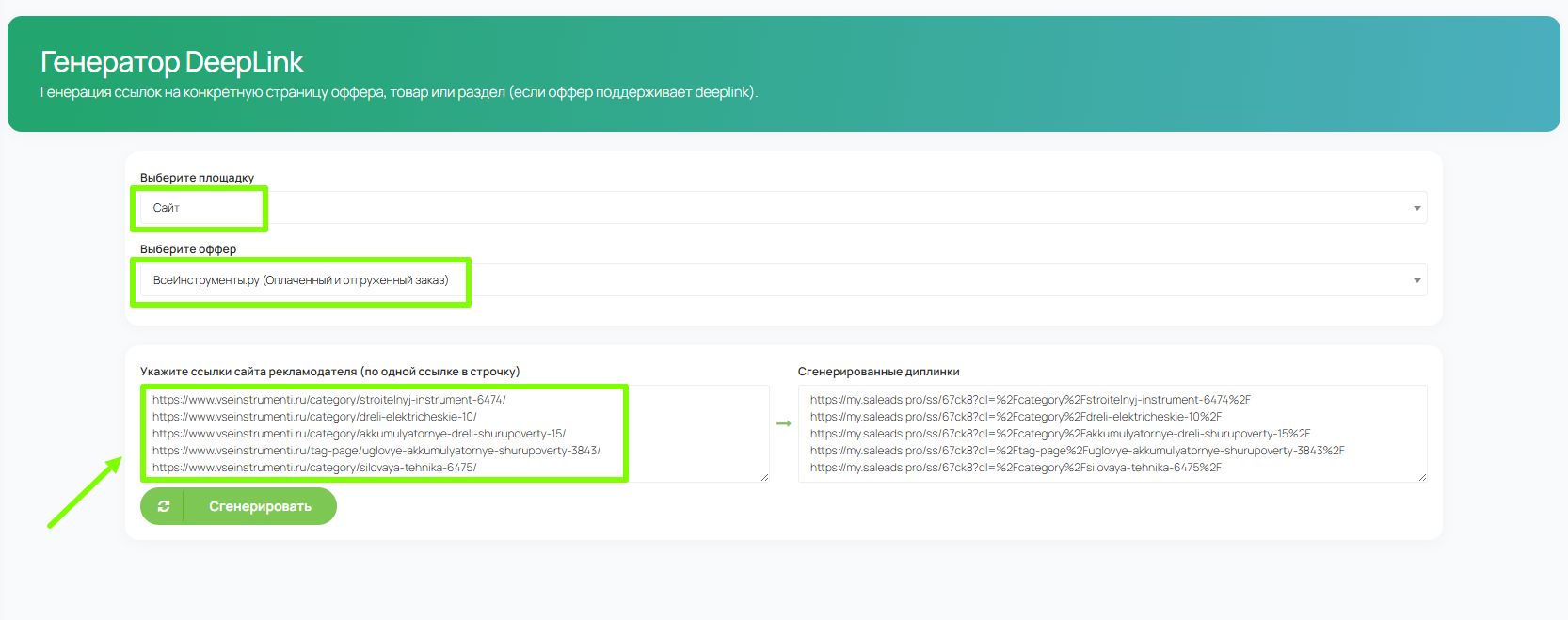 Этот инструмент позволяет создавать ссылки на конкретный товар или страницу рекламодателя. Чтобы им воспользоваться, необходимо перейти в раздел Инструменты → «DeepLink генератор». Далее нужно указать свою площадку и выбрать оффер из списка, который поддерживает генерацию таких ссылок. Оффер должен быть подключен к площадке, которую вы выберете.